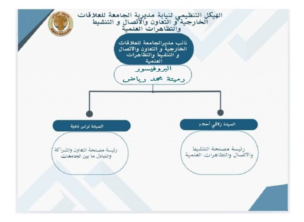 -تحيين الأنشطة الإعلامية. للاتصال بنا نيابة مديرية الجامعة للعلاقات الخارجية والتعاون والتنشيط والاتصال والتظاهرات العلمية 02 شارع ديدوش مراد، الجزائر العاصمة \ 16000، الجزائر