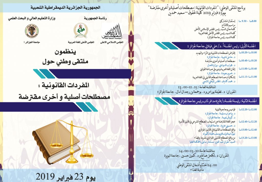 ملتقى دولي بعنوان المسؤولية المهنية: أي وجود قانوني؟ ورشة علمية بعنوان الجزائر أرض العيش معا في سلام ملتقى وطني بعنوان المفردات القانونية: مصطلحات أصلية وأخرى مقترضة ملتقى دولي: الذكاء الاصطناعي: تحد جديد للقانون؟ ملتقى دولي بعنوان جسم الانسان بين الضرورة الطبية والضوابط الشرعية والقانونية ملتقى دولي: تعايش الأنظمة القانونية في القانون الجزائري والمقاربات الجهوية للقانون ملتقى وطني بعنوان دكتوراه ل م د بين النصوص القانونية والتجربة